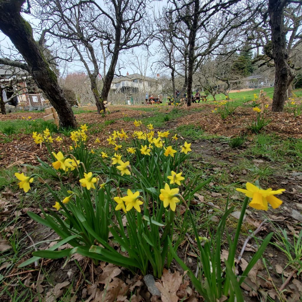 There’s currently a beautiful daffodils blooming explosion at the community orchard park. Come by for a visit and stroll through the small but plentifully packed, community orchard. It is open 24/7 to the general public.