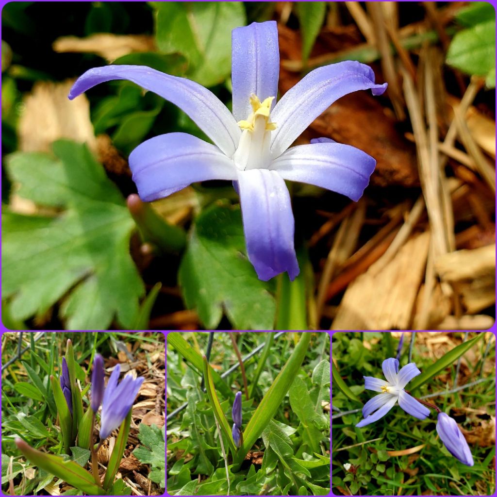 A field mustard plant with vibrant yellow flowers, green leaves, and buds, captured in three separate crops showcasing the plant in its entirety, a cluster of yellow flowers in bloom, and a close-up of a leaf’s edge.Close-up of blue-purple and white star hyacinth flowers in full bloom, with six pointed petals, yellow center, and varying green foliage and brown mulch in the background, surrounded by three smaller images of blooms at various stages of growth.A low-angle shot showcases a field of bright yellow daffodils in bloom, interspersed with green grass and scattered fallen leaves. Bare, gnarled fruit tree branches arch overhead against a slightly overcast sky. In the background, a few picnic tables in the orchard.