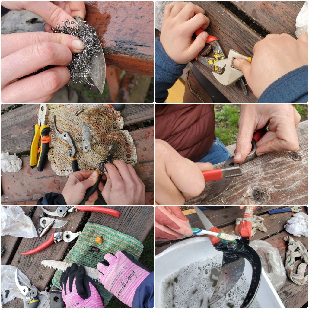 Collage of six images showing close-ups of hands cleaning and sharpening garden pruning shears and other tools on a wooden surface, including scrubbing with steel wool, using a knife to clean blades, and washing in a soapy bucket with a toothbrush.